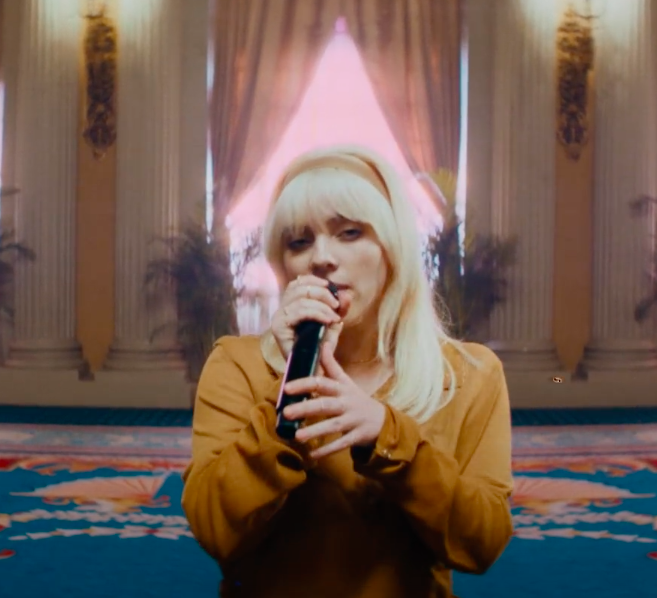She is back in the Crystal Ballroom of the Biltmore Hotel in Los Angeles and is once more accompanied by her brother, Finneas.