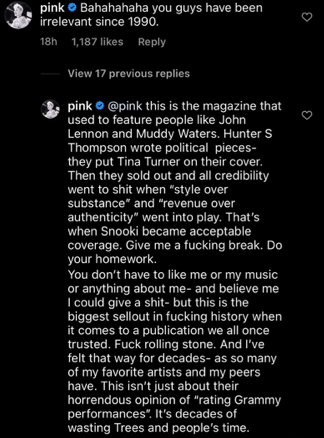 Lol Pink told no lies. That entire “list” is bullshyt, and nobody has taken rolling stone seriously since the 90s, they damn sure don’t pay any mind to their “lists”.