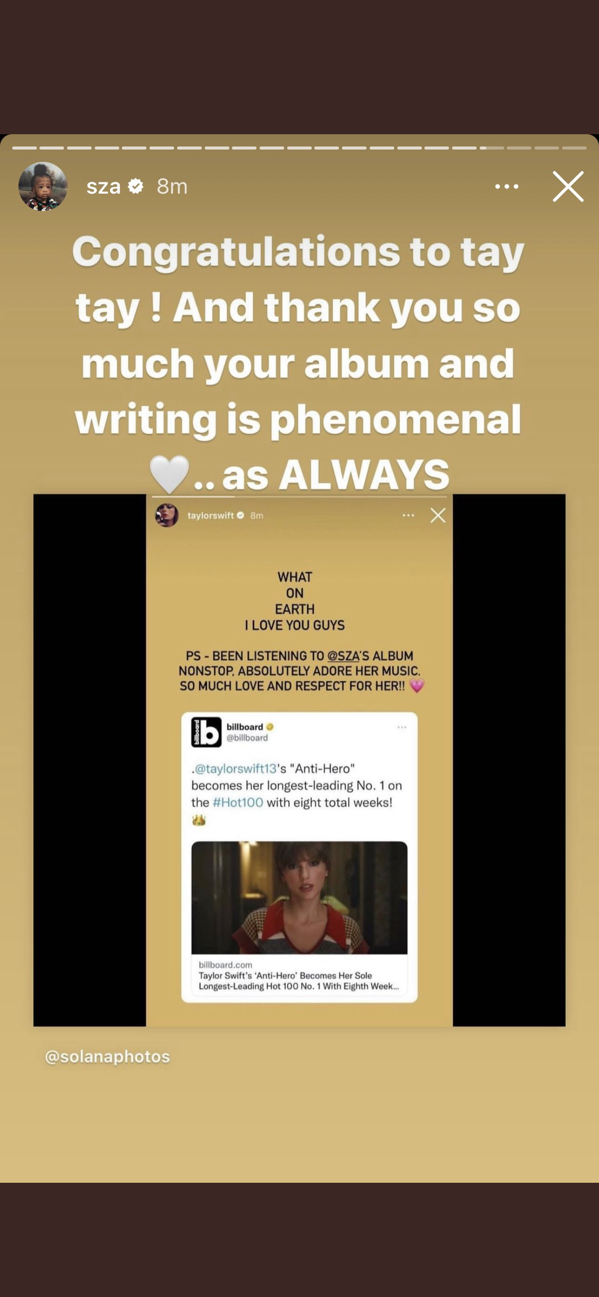 “Been listening to SZA’s album nonstop, absolutely adore her music. So much love and respect for her!!” Swift wrote on her Instagram Stories.