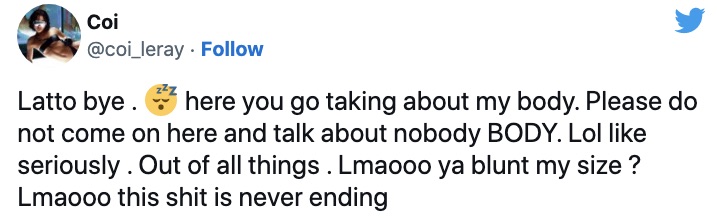 “Latto bye . ???? here you go taking about my body. Please do not come on here and talk about nobody BODY. Lol like seriously . Out of all things . Lmaooo ya blunt my size ? Lmaooo this sh*t is never ending.
