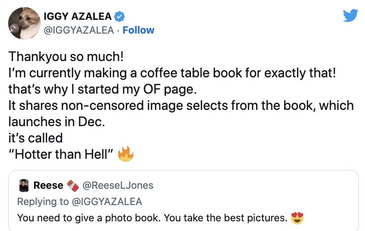 “Thank you so much! I’m currently making a coffee table book for exactly that! that’s why I started my OF page. It shares non-censored image selects from the book, which launches in Dec. it’s called “Hotter than Hell” ????”