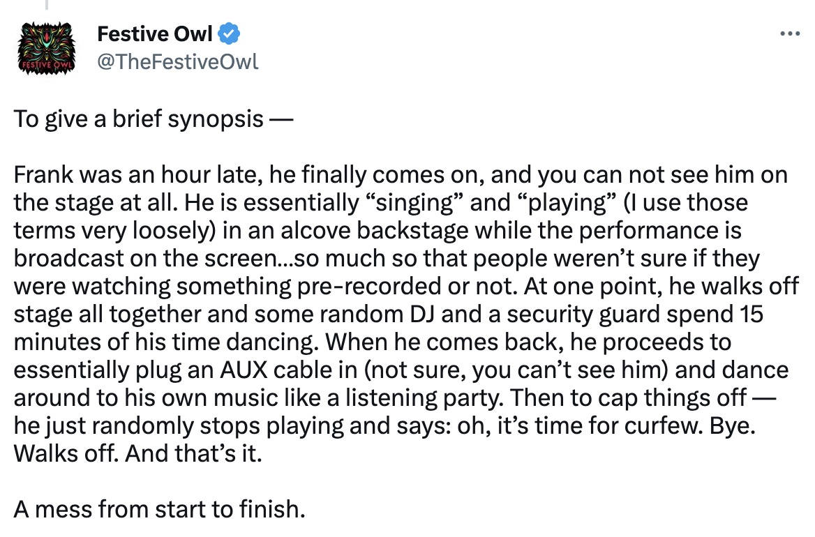 It was meant to be a colossal comeback, but Frank Ocean‘s polarizing performance at Coachella 2023 appears to be more sink than swim.