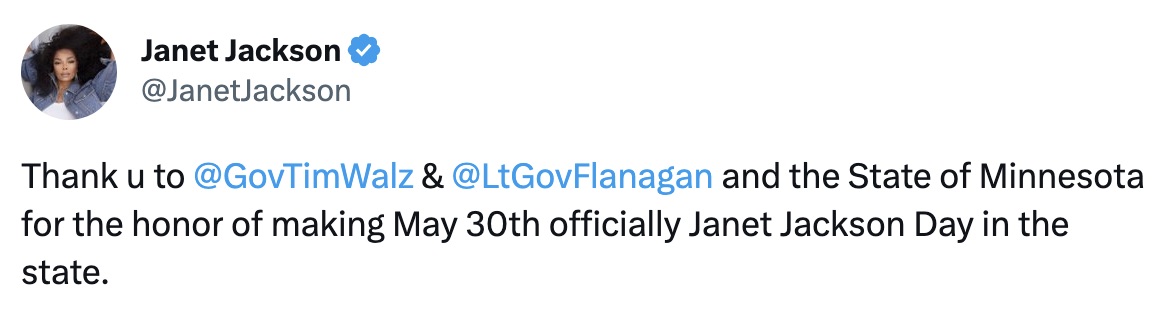 “Thank u to @GovTimWalz & @LtGovFlanagan and the State of Minnesota for the honor of making May 30th officially Janet Jackson Day in the state.”