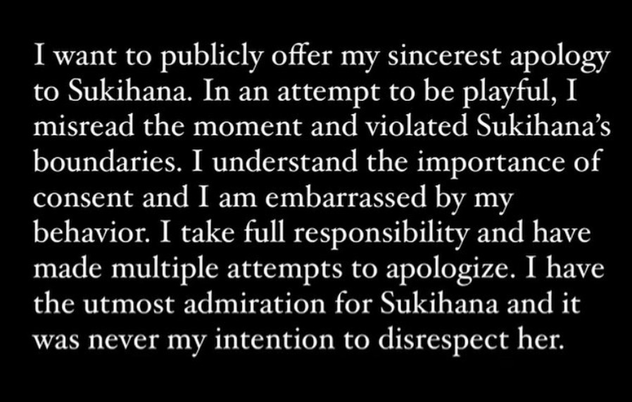 “I want to publicly offer my sincerest apology to Sukihana. In an attempt to be playful, I misread the moment and violated Sukihana’s boundaries. I understand the importance of consent and I am embarrassed by my behavior. I take full responsibility and have made multiple attempts to apologize. I have the utmost admiration for Sukihana and it was never my intention to disrespect her.”