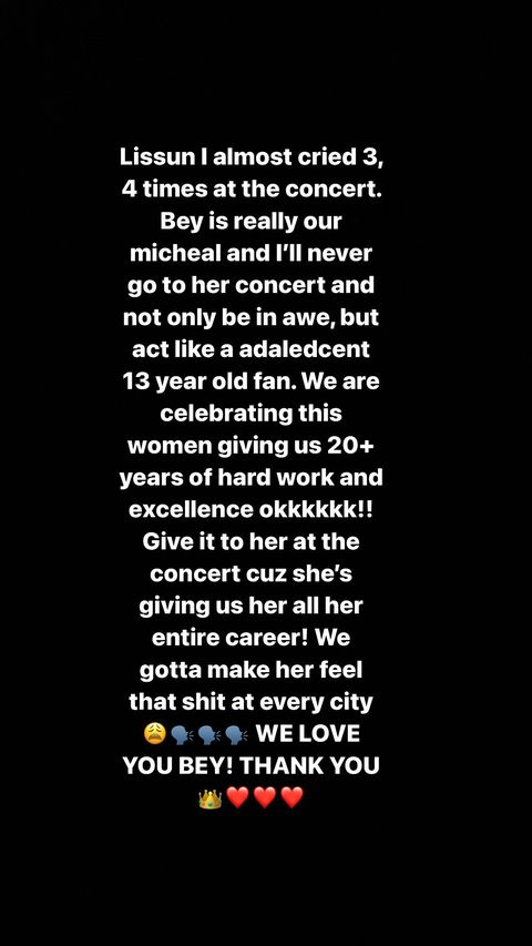 “Lissun I almost cried 3, 4 times at the concert. Bey is really our micheal and I’ll never go to her concert and not only be in awe, but act like a adaledcent 13 year old fan. We are celebrating this woman giving us 20+ years of hard work and excellence okkkkkk!! Give it to her at the concert cuz she’s giving us her all her entire career! We gotta make her feel that sh*t at every city © WE LOVE YOU BEY! THANK YOU”