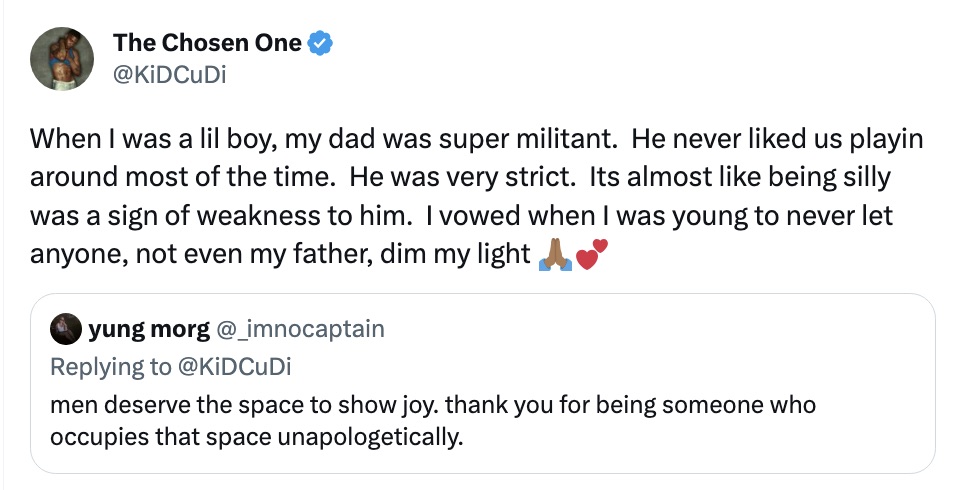 “When I was a lil boy, my dad was super militant. He never liked us playin around most of the time. He was very strict. Its almost like being silly was a sign of weakness to him. I vowed when I was young to never let anyone, not even my father, dim my light ????????????”