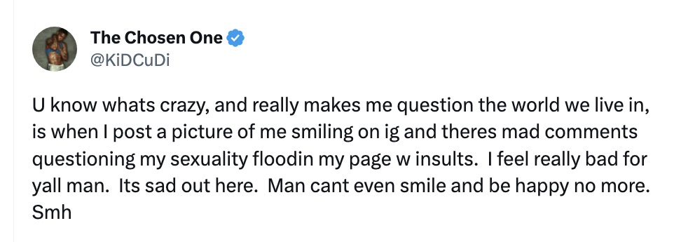 “U know whats crazy, and really makes me question the world we live in, is when I post a picture of me smiling on ig and theres mad comments questioning my sexuality floodin my page w insults. I feel really bad for yall man. Its sad out here. Man cant even smile and be happy no more. Smh.