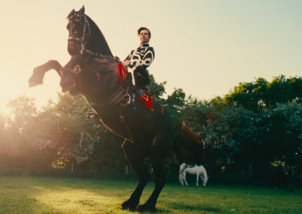 In one of the more prominent clips from the video, Styles can be seen riding a horse while another horse casually grazes in the background.