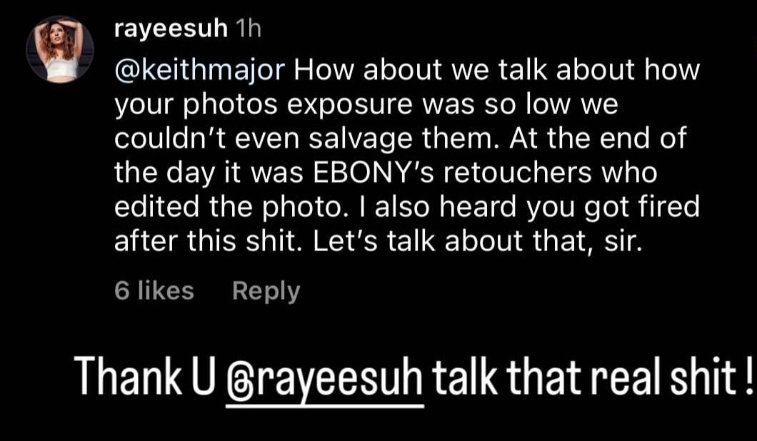 “Who is this? Cuz that’s not the photo I approved or any other content they’ve put out. I always told Ebony it looked like a painting, but they didn’t wanna listen. They said they loved it. It’s the sabotage for me. The funny sh*t about this is that this is THEIR retoucher!”