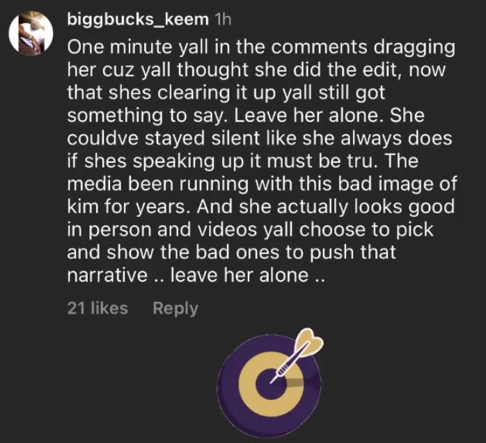 It’s always some s*** with her and her delusional fans. I believe the photographer over her. History has shown that Kim has obvious self hate issues. That pic is right up her alley.