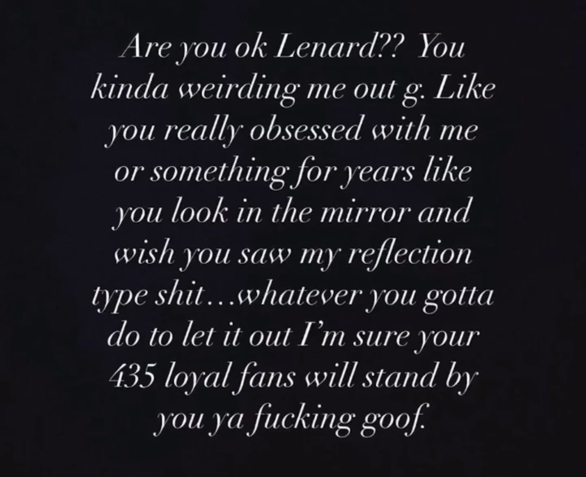 “Are you ok Lenard?? You kinda weirding me out g: Like you really obsessed with me or something for years like you look in the mirror and wish you saw my reflection type sh*t. .whatever you gotta do to let it out I’m sure your 435 loyal fans will stand by you ya f*cking goof.”