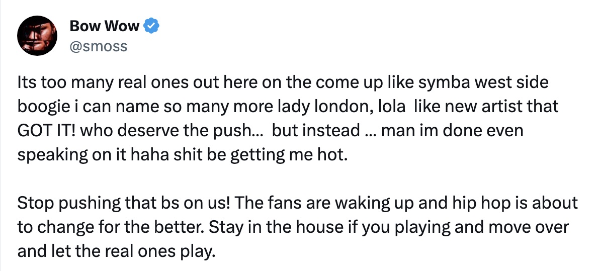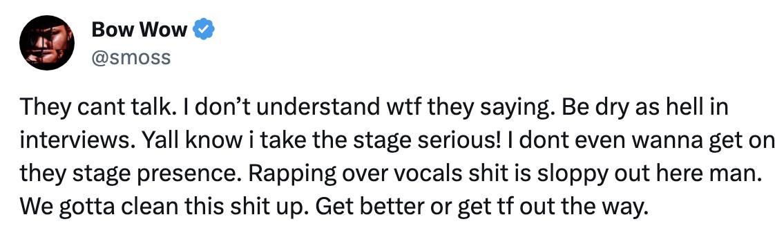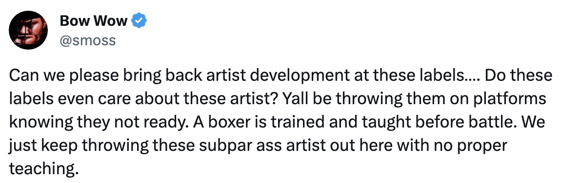 Taking to Twitter (X), the Bow Wow – born Shad Moss – bemoaned the lack of “artist development” amongst the new crop of stars.