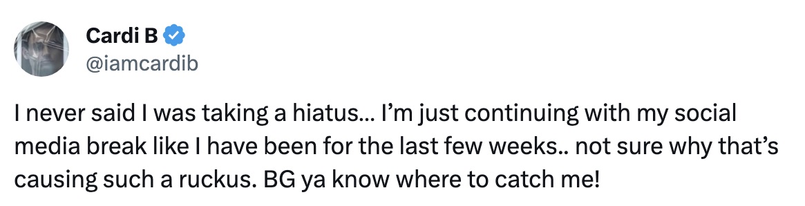 What hiatus? Didn’t she just drop a Bongos behind the scenes? She was just on Hot Ones too. Cardi’s haters need to come up with better lies lol