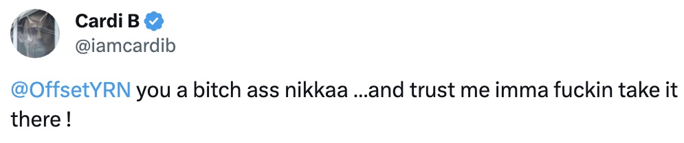 “@OffsetYRN you a bitch ass n*kkaa …and trust me imma f*ckin take it there!”