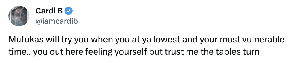“M**k*s will try you when you at ya lowest and your most vulnerable time.. you out here feeling yourself but trust me the tables turn.”