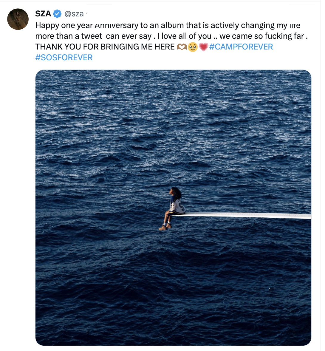 “A day late but Happy 1 year anniversary to an album that is ACTIVELY CHANGING MY LIFE .. like rn currently changing my life . I haven’t processed this year AT ALL cause it’s still happening .. this is beyond my wildest dreams . I never imagined we’d accomplish a fraction of the accolades that came from this .. it often doesn’t feel real and it’s funny cause I swore I’d know what to do if it ever happened ???? turns out I I froze .. I know the perils of drinking the koolaid so I won’t dabble in that .. but I have to express the immense GRATITUDE I have for every person that made this possible . Every person that’s been apart of this journey. Thank you to GOD and to my incredible TEAM and My FAMILY . My ancestors . Thank you to every person that streamed this album ,came to a show , blasted it in traffic and connected w ANY part of me . To everyone that continues to believe in me and be patient w me as I figure it all out . your my driving force . I love you ???? #campforever #SOSFOREVER