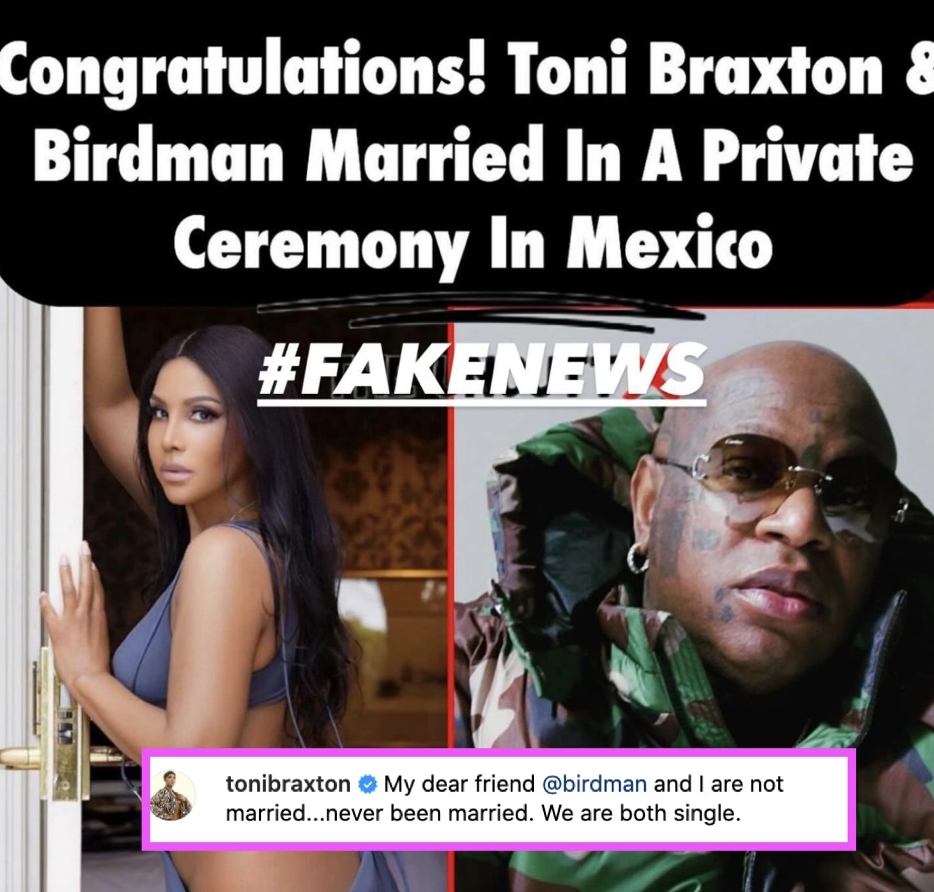 “My dear friend @birdman and I are not married…never been married. We are both single.”