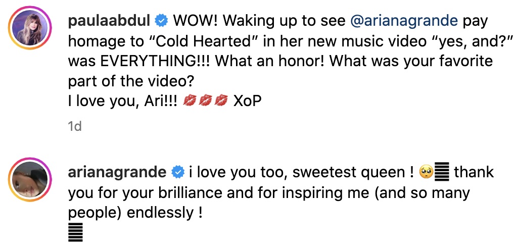 “WOW! Waking up to see @arianagrande pay homage to “Cold Hearted” in her new music video “yes, and?” was EVERYTHING!!! What an honor! What was your favorite part of the video? I love you, Ari!!! ???????????? XoP”