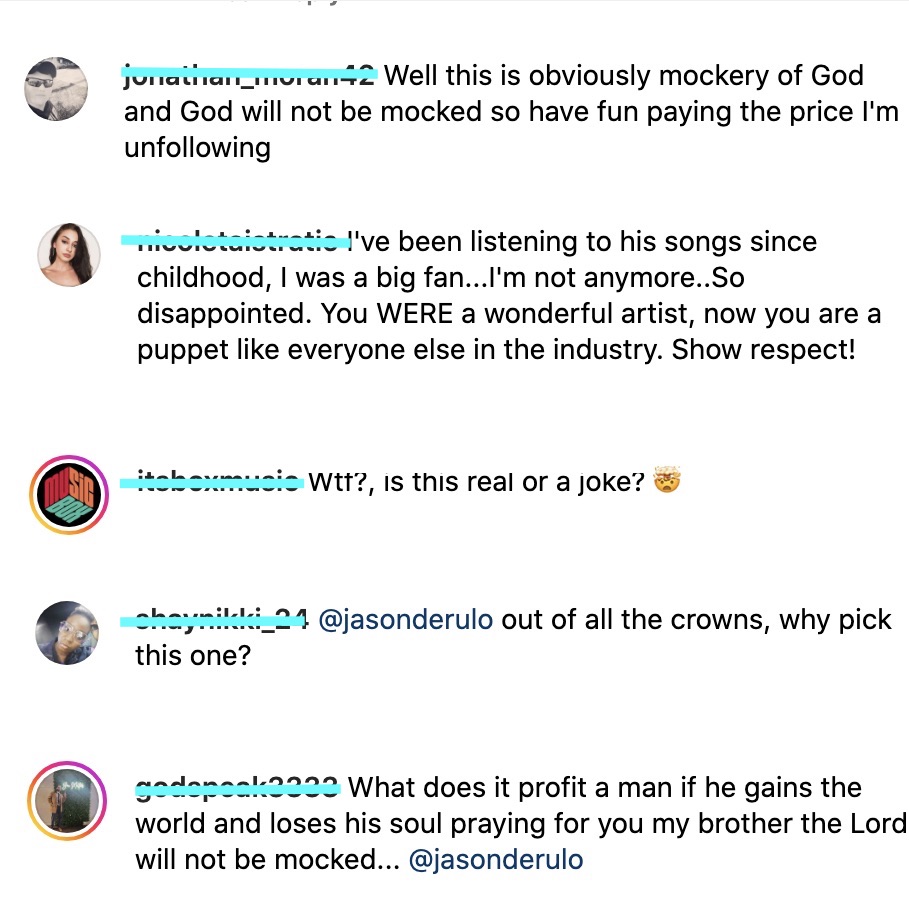 Derulo is seen rocking a crown of thorns – which many commenters on his Instagram post feel is a mocking recreation of Jesus Christ (on whom a crown of thorns was placed during the biblical story of the crucifixion).