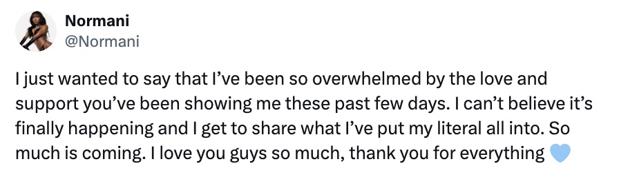 “I just wanted to say that I’ve been so overwhelmed by the love and support you’ve been showing me these past few days. I can’t believe it’s finally happening and I get to share what I’ve put my literal all into. So much is coming. I love you guys so much, thank you for everything.”