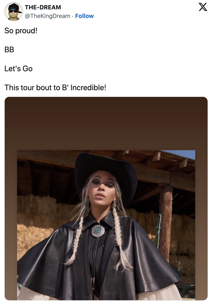 Taking to Twitter/X to congratulate Queen Bey on the release of her latest album ‘Cowboy Carter’ (which he also contributed to), the hitmaker shared what many are deeming a tour tease. For, he wrote: