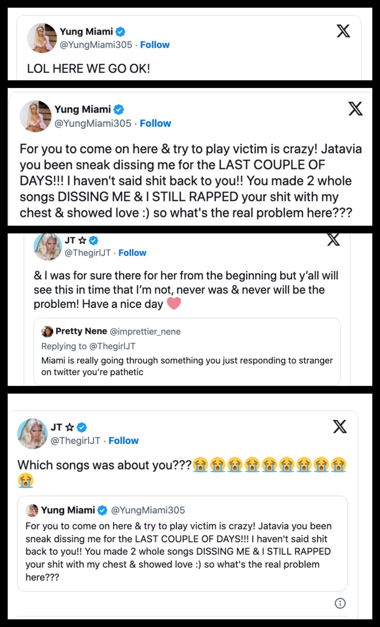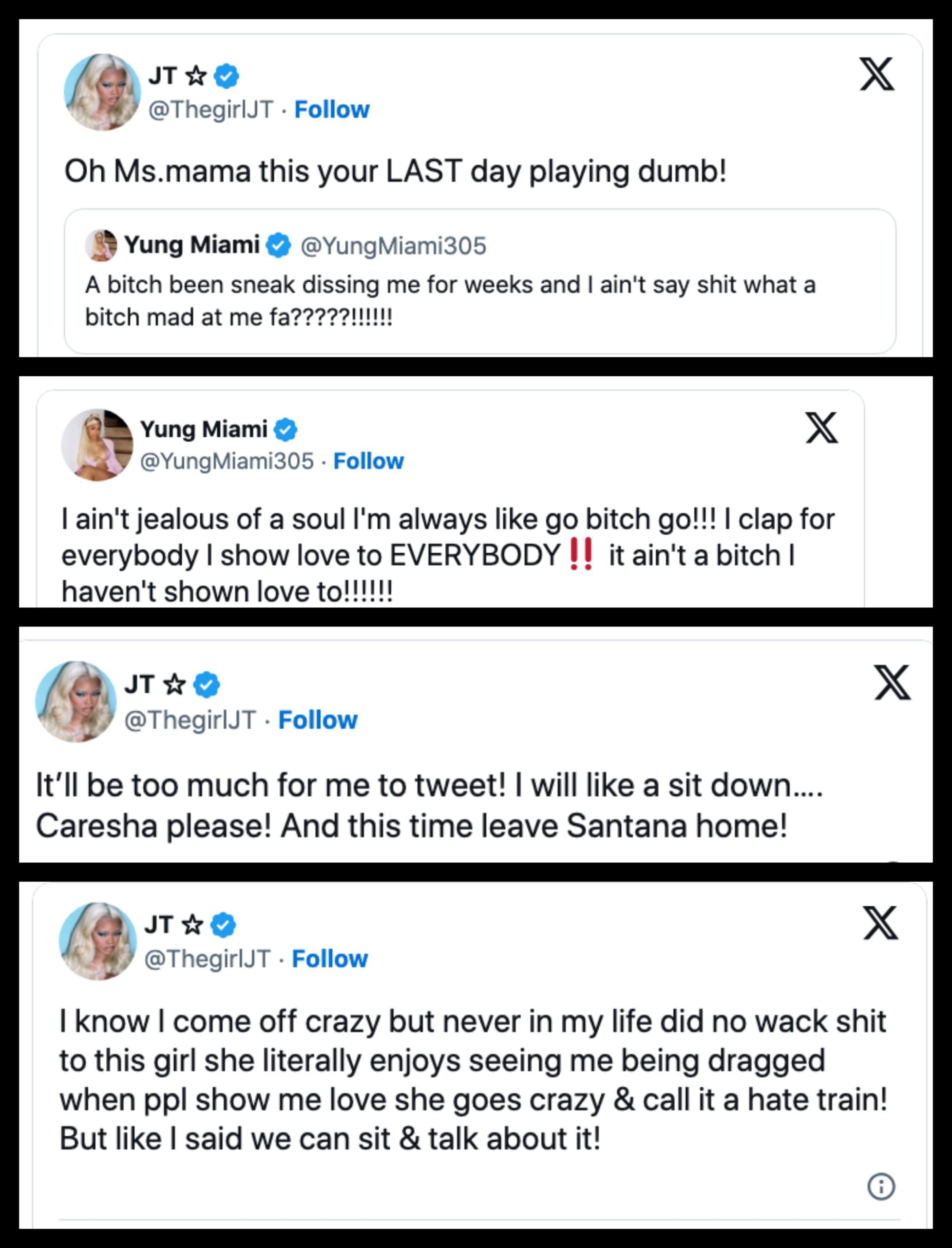 They been giving tension and weird energy for years now. JT is an insecure mean girl and Miami is a thirsty clout chasing social climber. Both have left each other hanging out to dry in their times of need. QC never gave them the push or promotion they deserved.