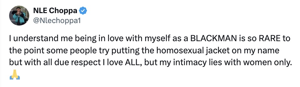 “I understand me being in love with myself as a BLACKMAN is so RARE to the point some people try putting the homosexual jacket on my name but with all due respect I love ALL, but my intimacy lies with women only.”