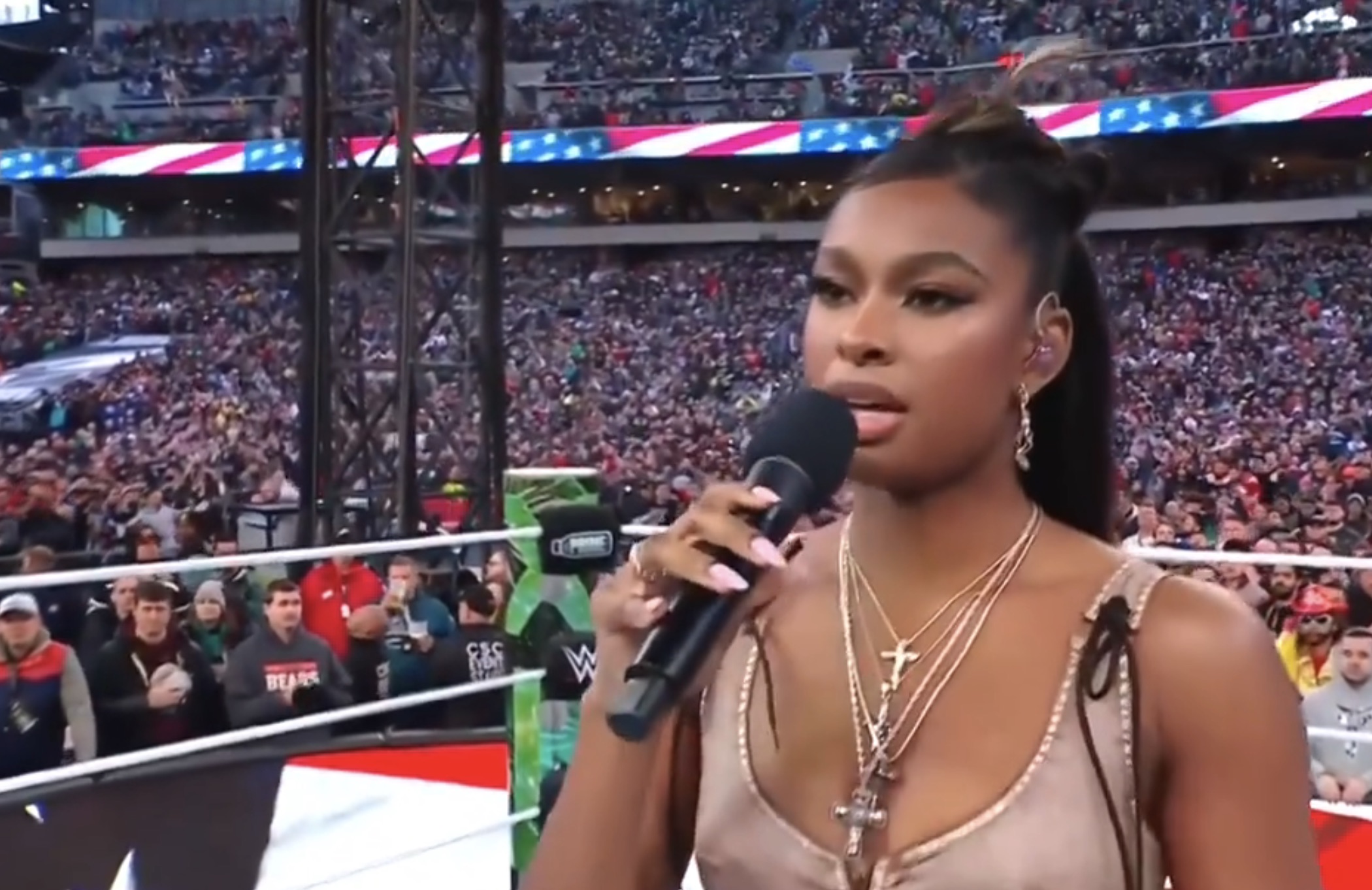 The GRAMMY Award-winning R&B star was on hand at night 1 of the milestone anniversary of the annual wrestling extravaganza to perform the US National Anthem.