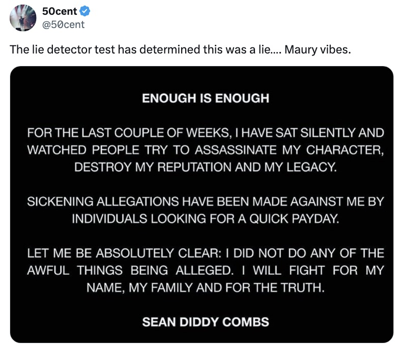 50 Cent Trolls Diddy’s Claims of Innocence After Cassie Attack Video: “Lie Detector Has Determined This Was a Lie”