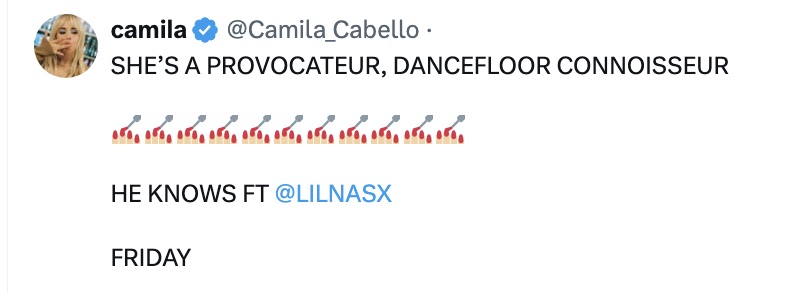 “SHE’S A PROVOCATEUR, DANCEFLOOR CONNOISSEUR ???????????????????????????????????????????????????????????????????????????????????????? HE KNOWS FT @LILNASX FRIDAY”