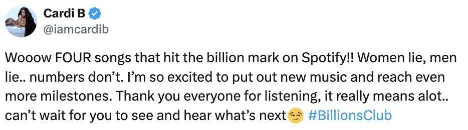 “Wooow FOUR songs that hit the billion mark on Spotify!! Women lie, men lie.. numbers don’t. I’m so excited to put out new music and reach even more milestones. Thank you everyone for listening, it really means alot.. can’t wait for you to see and hear what’s next???? #BillionsClub”
