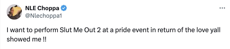 Taking to Twitter, the rapper expressed a desire to perform at a Pride 2024 event to thank the community for supporting his colorful single ‘Sl*t Me Out 2.’