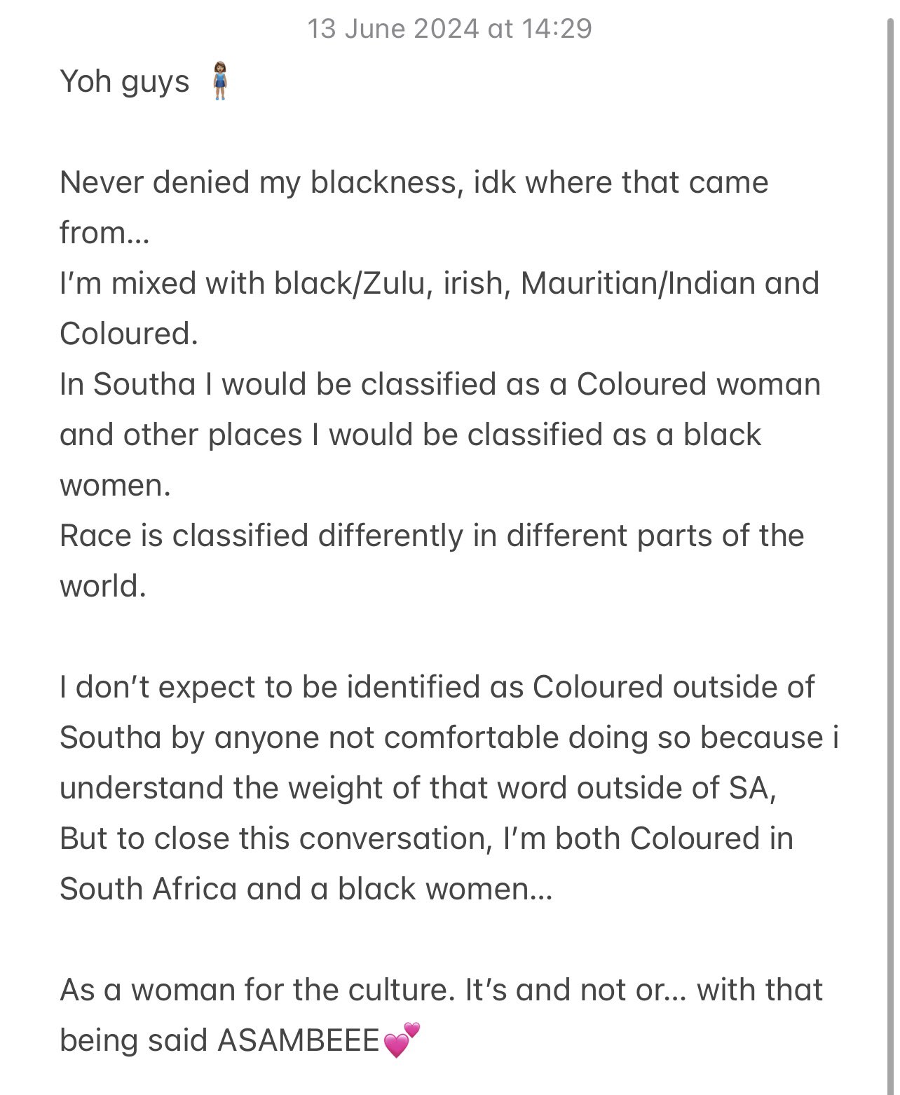 Her telling you she’s coloured isnt a denial of her black heritage. Its acknowledging her blackness is one of the things she encompasses.
