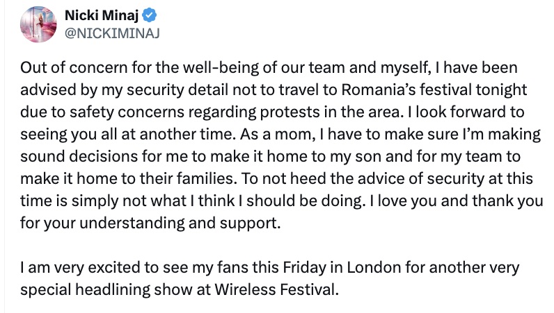“Out of concern for the well-being of our team and myself, I have been advised by my security detail not to travel to Romania’s festival tonight due to safety concerns regarding protests in the area. I look forward to seeing you all at another time. As a mom, I have to make sure I’m making sound decisions for me to make it home to my son and for my team to make it home to their families. To not heed the advice of security at this time is simply not what I think I should be doing. I love you and thank you for your understanding and support. I am very excited to see my fans this Friday in London for another very special headlining show at Wireless Festival.”