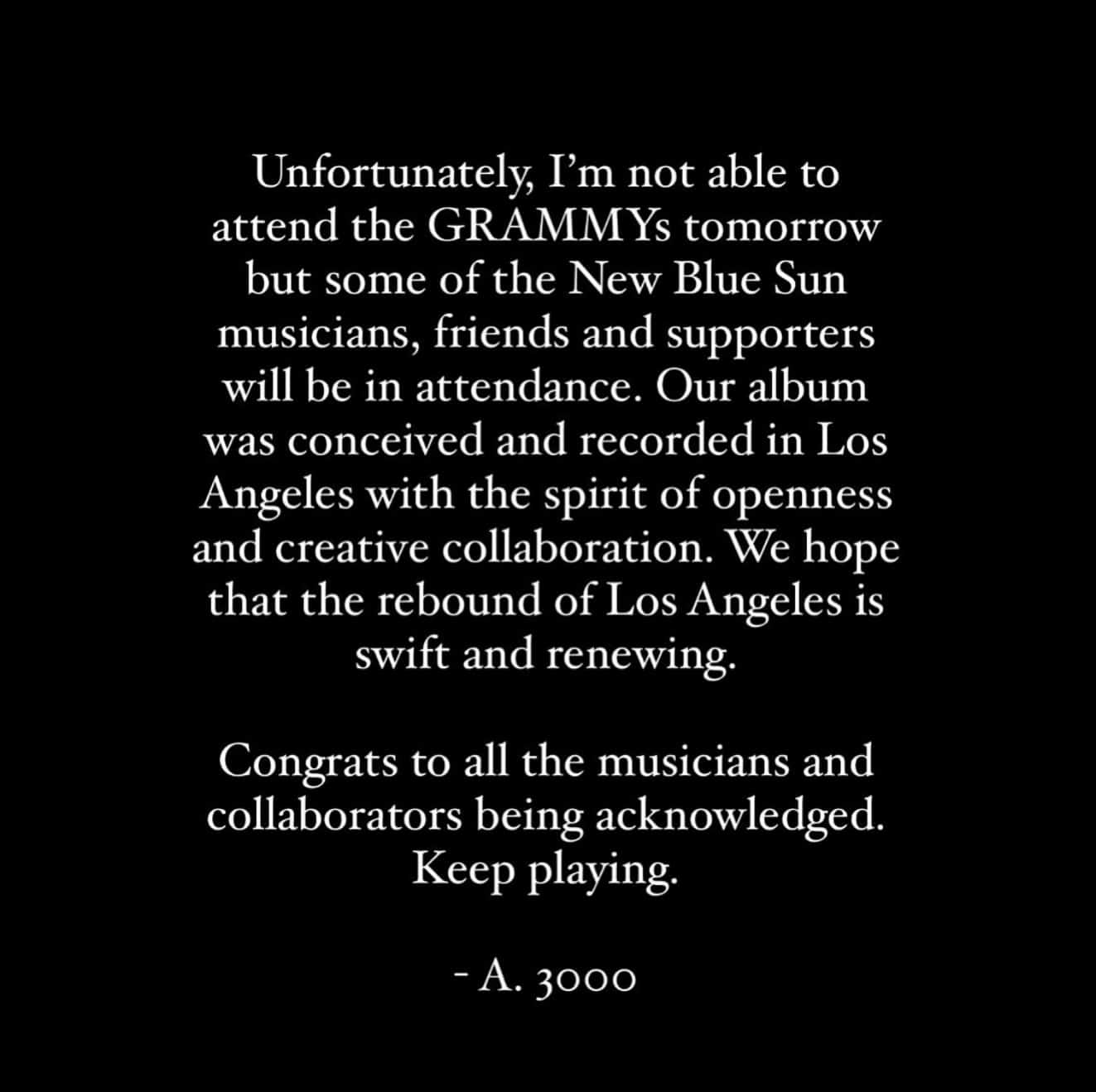 “Unfortunately, I’m not able to attend the GRAMMYs tomorrow but some of the New Blue Sun musicians, friends and supporters will be in attendance. Our album was conceived and recorded in Los Angeles with the spirit of openness and creative collaboration. We hope that the rebound of Los Angeles is swift and renewing.