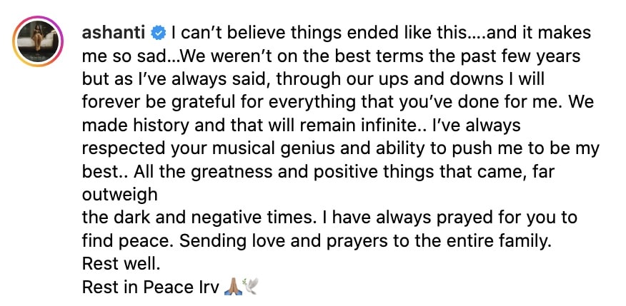 “I can’t believe things ended like this….and it makes me so sad…We weren’t on the best terms the past few years but as I’ve always said, through our ups and downs I will forever be grateful for everything that you’ve done for me. We made history and that will remain infinite.. I’ve always respected your musical genius and ability to push me to be my best.. All the greatness and positive things that came, far outweigh the dark and negative times. I have always prayed for you to find peace. Sending love and prayers to the entire family.