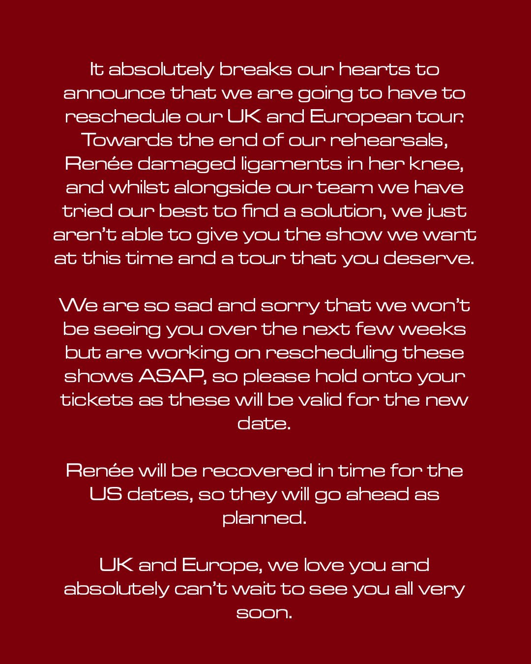 “It absolutely breaks our hearts to announce that we are going to have to reschedule our UK and European tour. Towards the end of our rehearsals, Renée damaged ligaments in her knee, and whilst alongside our team we have tried our best to find a solution, we just aren’t able to give you the show we want at this time and a tour that you deserve.