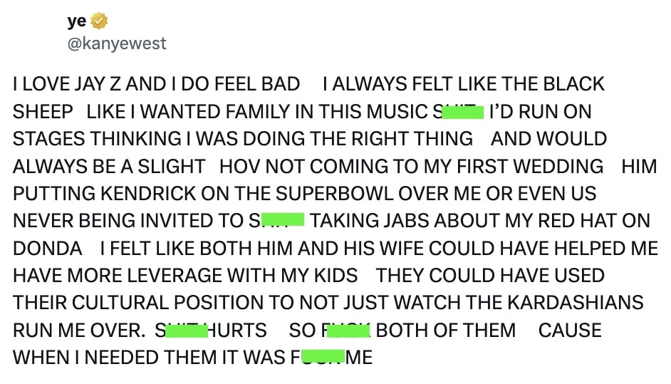 “I LOVE JAY Z AND I DO FEEL BAD I ALWAYS FELT LIKE THE BLACK SHEEP LIKE I WANTED FAMILY IN THIS MUSIC SH*T I’D RUN ON STAGES THINKING I WAS DOING THE RIGHT THING AND WOULD ALWAYS BE A SLIGHT HOV NOT COMING TO MY FIRST WEDDING HIM PUTTING KENDRICK ON THE SUPERBOWL OVER ME OR EVEN US NEVER BEING INVITED TO SHIT TAKING JABS ABOUT MY RED HAT ON DONDA I FELT LIKE BOTH HIM AND HIS WIFE COULD HAVE HELPED ME HAVE MORE LEVERAGE WITH MY KIDS THEY COULD HAVE USED THEIR CULTURAL POSITION TO NOT JUST WATCH THE KARDASHIANS RUN ME OVER. SH*T HURTS SO F*CK BOTH OF THEM CAUSE WHEN I NEEDED THEM IT WAS F*CK ME”