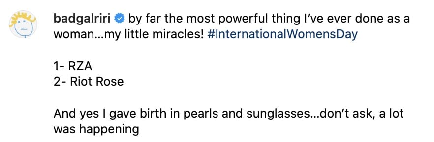 Looking fashionable as ever, RiRi celebrated her “little miracles” and the power she feels being a mother.