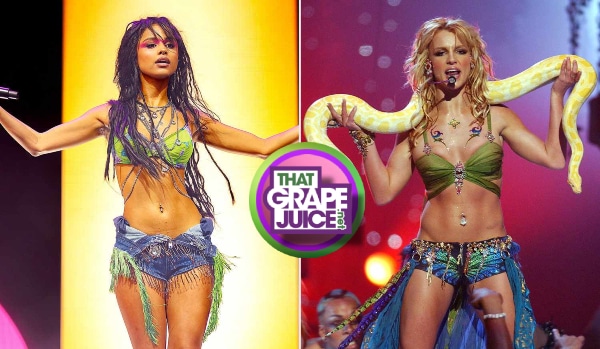 During her performance on Friday (April 18), the ‘Water‘ songstress made a splash while wearing an ensemble that immediately drew comparisons to Britney’s unforgettable ‘I’m a Slave 4 U’ costume at the 2001 VMAs.
