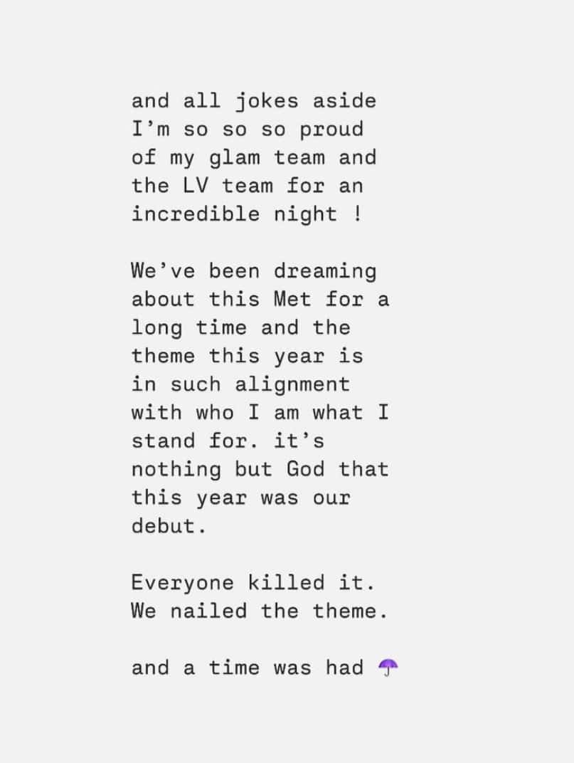 “And all jokes aside, I’m so so so proud of my glam team and the LV team for an incredible night!