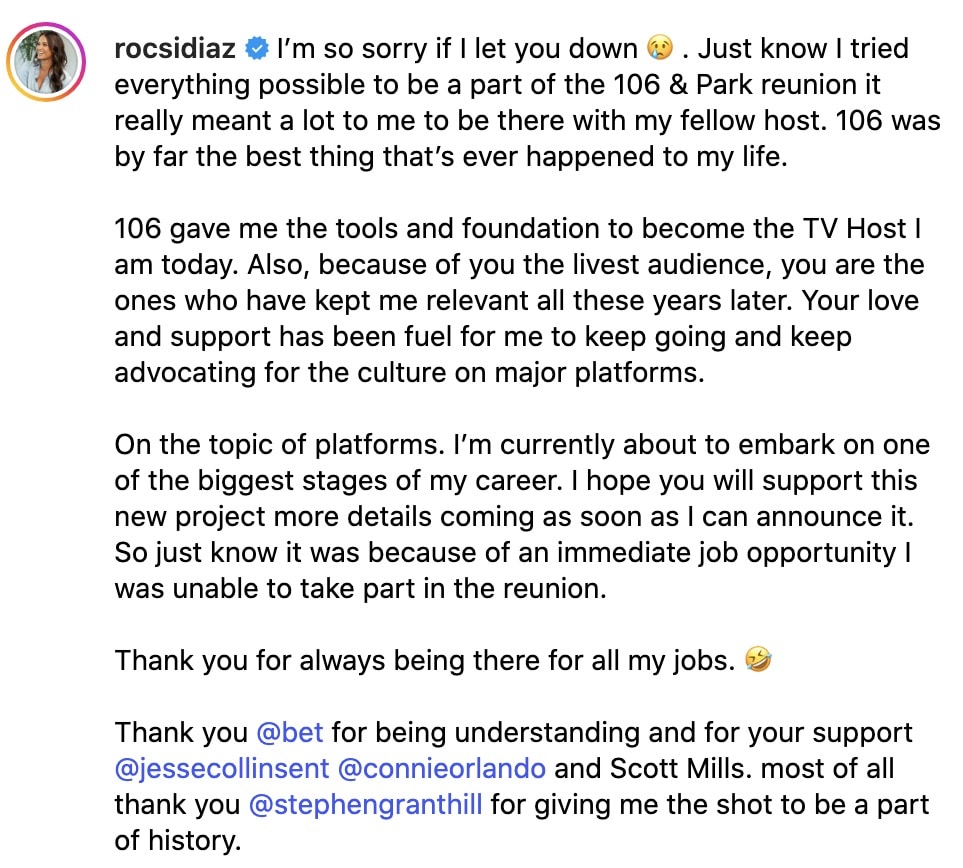 “I’m so sorry if I let you down 😢 . Just know I tried everything possible to be a part of the 106 & Park reunion it really meant a lot to me to be there with my fellow host. 106 was by far the best thing that’s ever happened to my life.