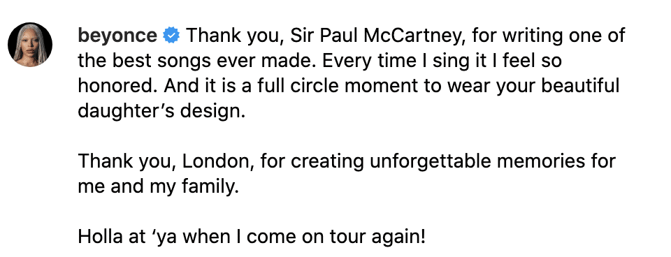 “Thank you, Sir Paul McCartney, for writing one of the best songs ever made. Every time I sing it I feel so honored. And it is a full circle moment to wear your beautiful daughter’s design.