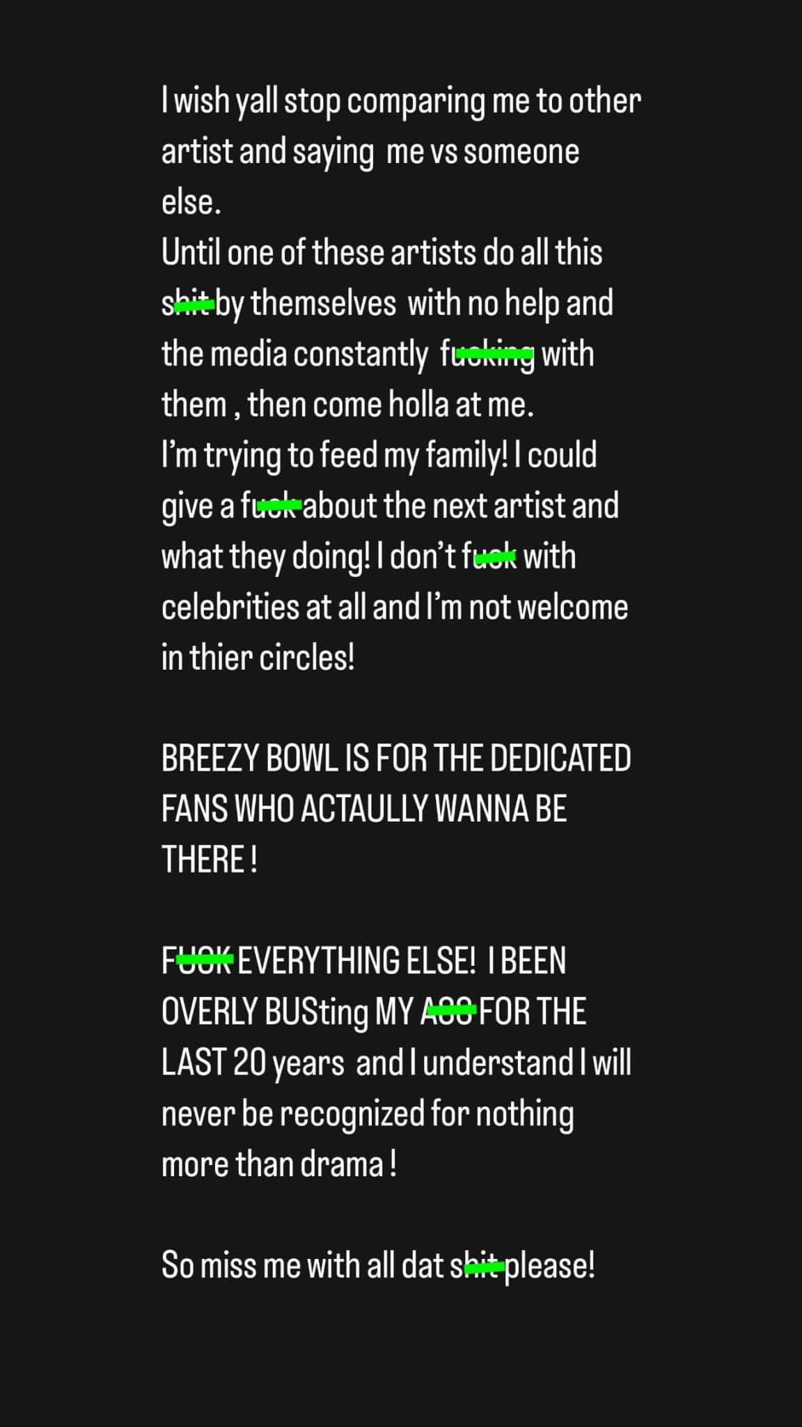 Until one of these artists do all this sh*t by themselves with no help and the media constantly f*cking with them, then come holla at me. I’m trying to feed my family! I could give a f*ck about the next artist and what they doing! I don’t f*ck with celebrities at all and I’m not welcome in thier circles!BREEZY BOWL IS FOR THE DEDICATED FANS WHO ACTAULLY WANNA BE THERE!