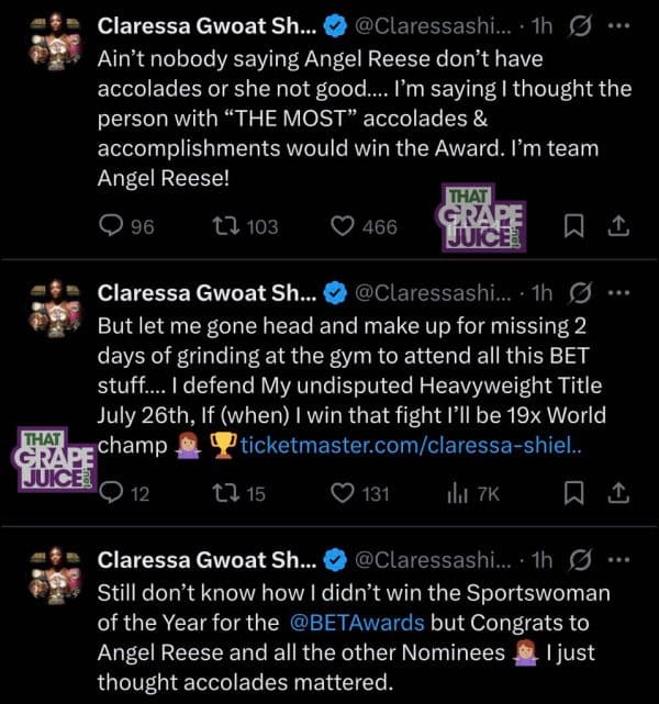 “Still don’t know how I didn’t win the Sportswoman of the Year for the @BETAwards but Congrats to Angel Reese and all the other Nominees,” she posted with a shrug emoji before sharing, “I just thought accolades mattered.”