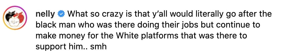 “What so crazy is that y’all would literally go after the black man who was there doing their jobs but continue to make money for the White platforms that was there to support him.. smh.”