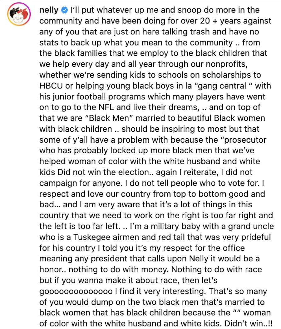“Again I reiterate, I did not campaign for anyone. I do not tell people who to vote for. I respect and love our country from top to bottom good and bad… and I am very aware that it’s a lot of things in this country that we need to work on the right is too far right and the left is too far left. .. I’m a military baby with a grand uncle who is a Tuskegee airmen and red tail that was very prideful for his country I told you it’s my respect for the office meaning any president that calls upon Nelly it would be a honor.. nothing to do with money. Nothing to do with race but if you wanna make it about race, then let’s goooooooooooooo I find it very interesting. That’s so many of you would dump on the two black men that’s married to black women that has black children because the ““ woman of color with the white husband and white kids. Didn’t win..!!”