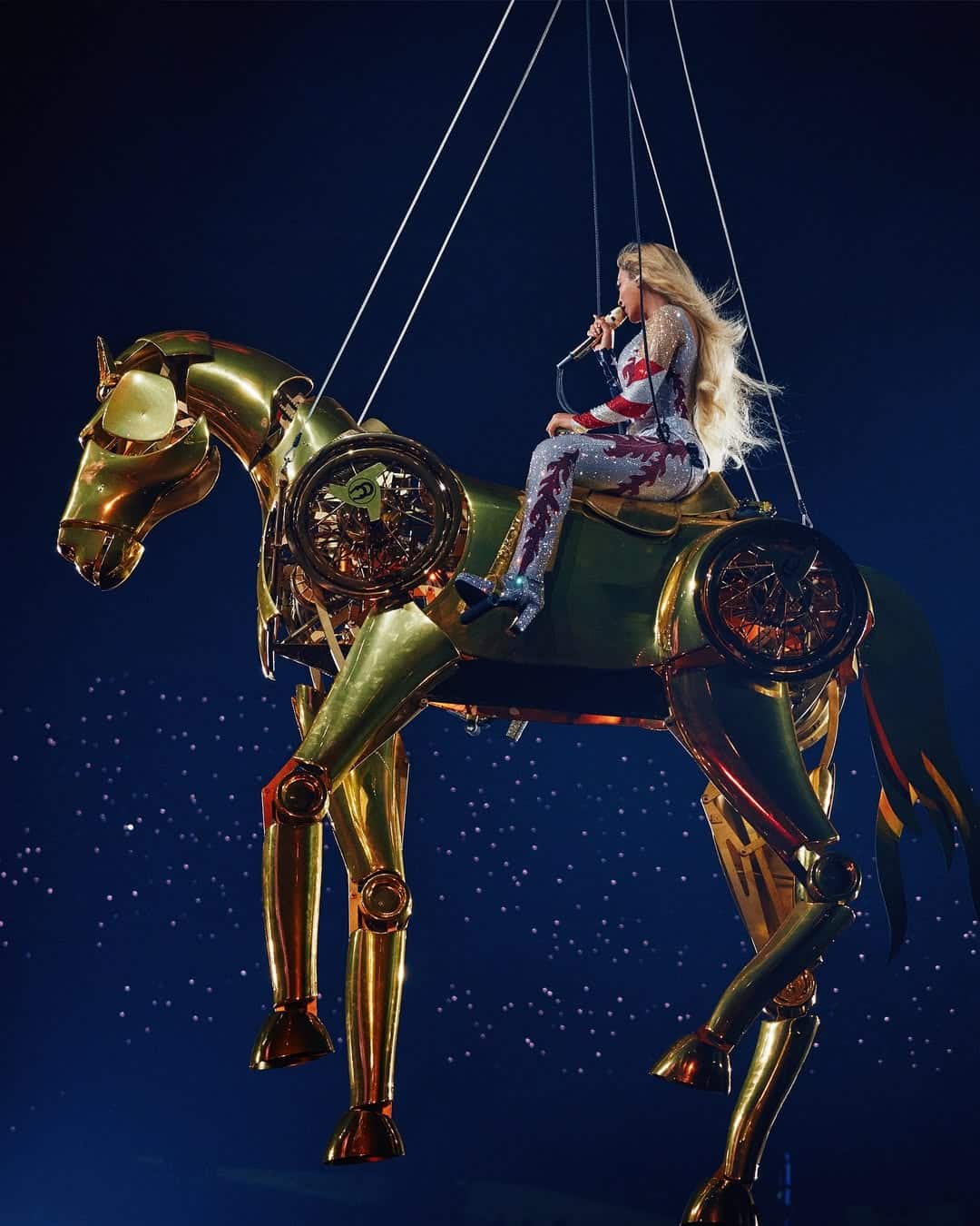 beyoncé debuts a new golden mechanical horse for ‘16 carriages’ at the cowboy carter tour in atlanta, reppin’ houston with swangas on its sides. pic.twitter.com/HUuCuNMUST