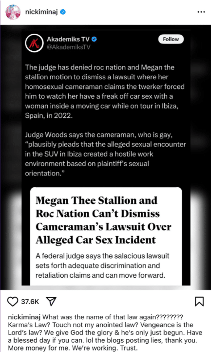 “What was the name of that law again???????? Karma’s Law? Touch not my anointed law? Vengeance is the Lord’s law? We give God the glory & he’s only just begun. Have a blessed day if you can. lol the blogs posting lies, thank you. More money for me. We’re working. Trust,” she posted to her 225 million followers on the platform.