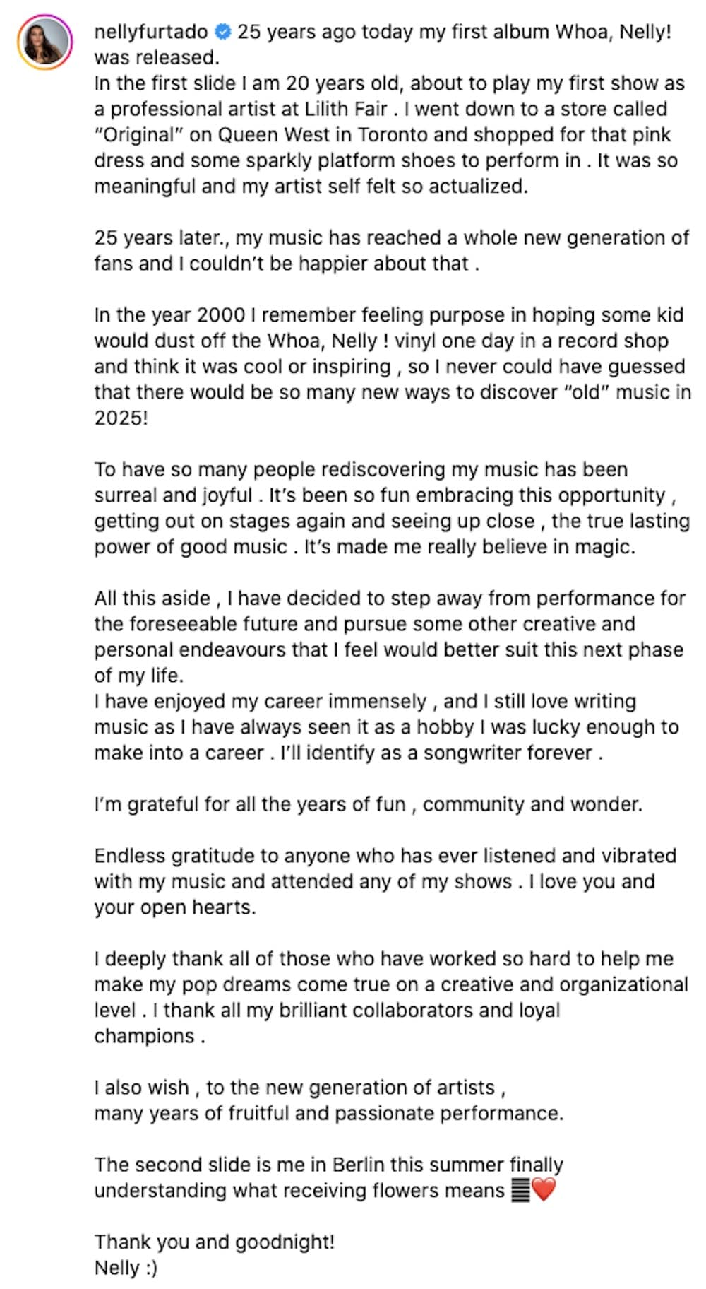 Taking to Instagram, the singer-songwriter dually saluted the 25th anniversary of her debut studio album, ‘Whoa, Nelly!,’ and announced her decision to “step away” from performing.